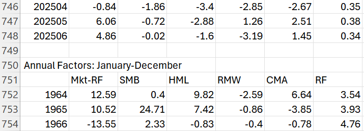 Halfway through the csv file, after the monthly return data, we start to see the annual returns data. We do not need this, so we will stop reading our file after we see the “Annual Factors” line. This is handled in the code below too, where we break the loop after getting to this line (we pass the “Annual Factors” in skip_text when using this function later).