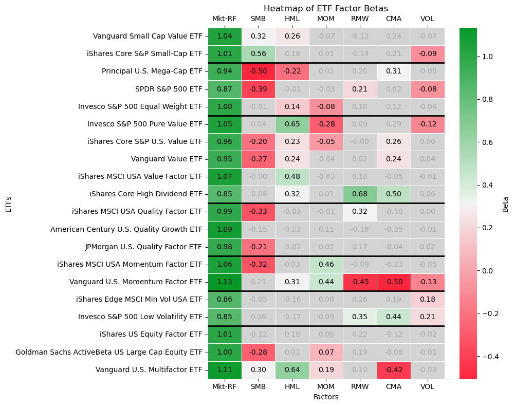 plt.show()Let’s end off with a heatmap showing the factor betas for all ETFs we analyzed. I have added black horizontal lines to the heatmap to divide the ETFs into how we categorized them earlier: small‑cap, large‑cap/core market, value, quality, momentum, low volatility, and multi‑factor. Also:
