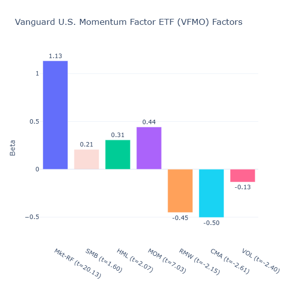 VFMO also has strong momentum (MOM = 0.44, t = 7.03) but adds other factor tilts: positive value (HML = 0.31, t = 2.07), strong negative profitability tilt (RMW = -0.45, t = -2.15) and strong aggressive investment tilt (CMA = -0.50, t = -2.61).