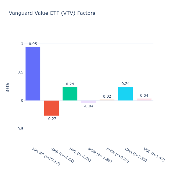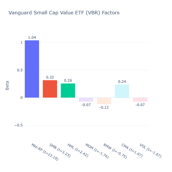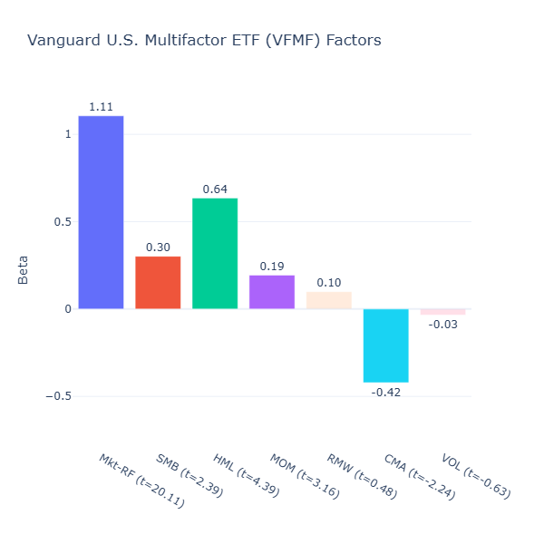 VFMF is much more aggressive in its factor bets: strong positive value tilt (HML = 0.64, t = 4.39), positive size tilt (SMB = 0.30, t = 2.39), and positive momentum tilt (MOM = 0.19, t = 3.16). Interestingly, it also shows a strong negative investment tilt (CMA = –0.42, t = –2.24), indicating a preference for companies reinvesting aggressively. These small and aggressive companies with strong momentum can be volatile, so even though it tries to capture low volatility in its description, its low‑volatility exposure is negligible (VOL = -0.03, t = –0.63).