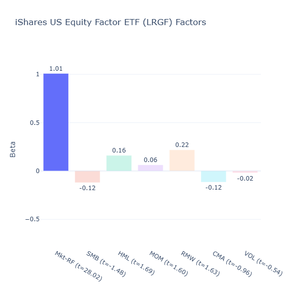 LRGF spreads exposures fairly evenly, but factor tilts are generally mild, with no exposure reaching conventional 5% significance level (all t-values are < 2). Although this is consistent with its design to keep factor exposures balanced so no single one dominates, one might question whether such muted exposures truly deliver a distinct factor‑based return profile.