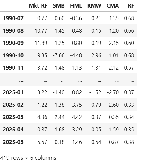 return df_factorsGet Fama French 5 Factors Data from Kenneth French’s Data Library