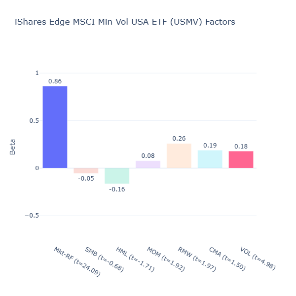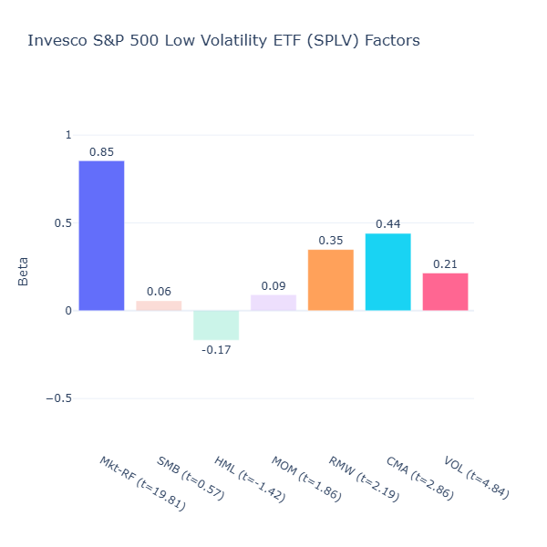 Interestingly, it has a positive profitability (CMA = 0.35, t = 2.19) and conservative investment tilt (CMA = 0.44, t = 2.86). The is because the S&P 500 is already a profitable, high‑quality large‑cap universe. When you take the 100 least volatile names from that pool, you end up with an even more concentrated set of stable, profitable companies which is often from defensive sectors like utilities, consumer staples, and healthcare.