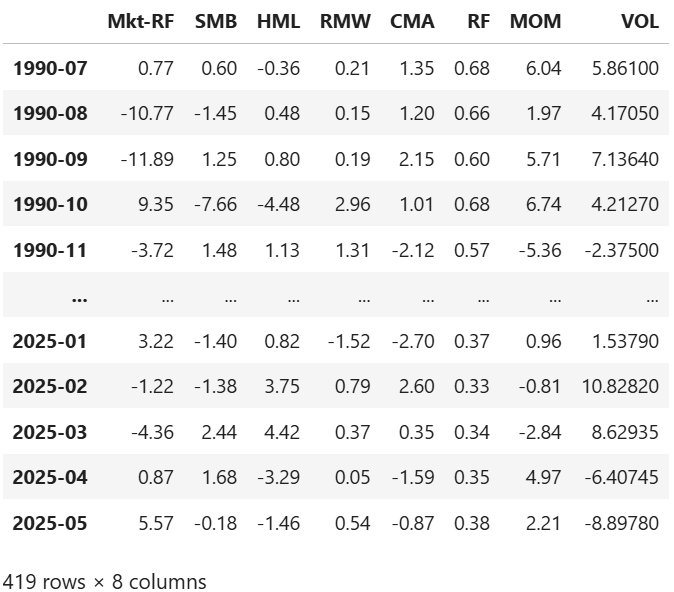return json.loads(data)Get Factors Data from Kenneth French’s Data Library