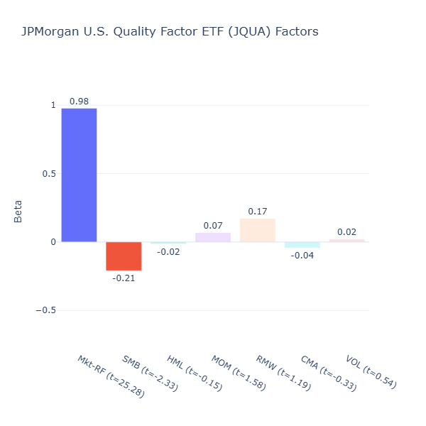 JQUA does not seem to be meaningfully exposed to any of the factors too, despite it being described as capturing U.S. stocks with high profitability. This is similar to QGRO in that the methodology may be too broad or diversified to produce a strong, measurable tilt in any one factor at the moment. While it screens for profitability, stable earnings growth, and low leverage, the combination of criteria (and possibly the current market environment) appears to have diluted the quality signal.