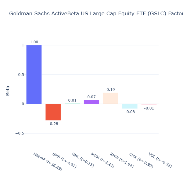 GSLC has a moderately negative size tilt (SMB = –0.28, t = –4.61) as it targets only large cap stocks. The rest of the factors are not significant. Like LRGF, GSLC aims for balanced exposure.