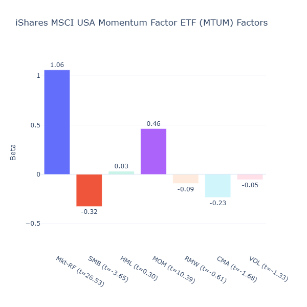 MTUM offers strong momentum (MOM = 0.46, t = 10.39) with a clear large cap tilt (SMB = –0.32, t = -3.65), which matches its description in a straightforward way.