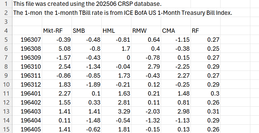 df_factors = pd.read_csv(monthly_csv, skiprows=skiprows, index_col=0) # rows are skipped to avoid description in the CSVs