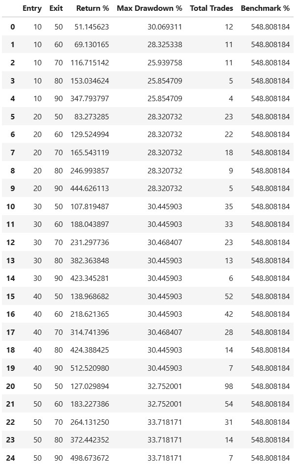 strategy is the best performer, with a return of over 544.7% — the highest across the entire grid, in big contrast to the 347.8% returns in the second last column.As inferred from the last two columns, the difference in returns between