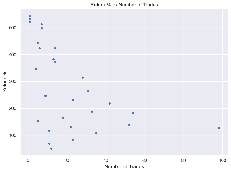 Here we plot a scatterplot of Return % vs Number of Trades.